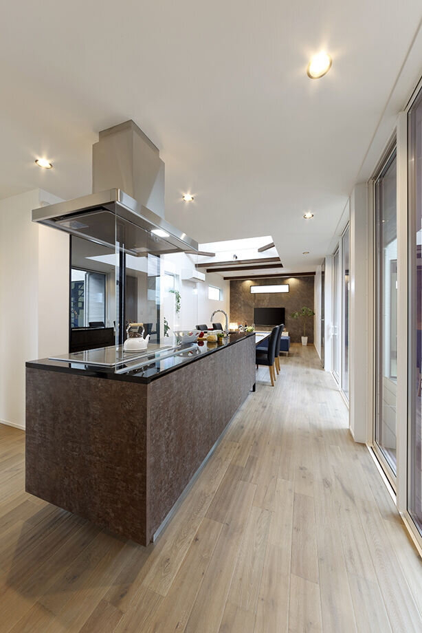 縦に色を分けたバイカラーで立体感が印象的な外観デザインは、窓の配置を揃えることで家全体のバランスを良くまとめています。エントランスは一面大理石の床やスタイリッシュな鉄骨階段、さらに正面にFIX窓を設置し、コの字型のお庭を望めるラグジュアリー空間に。家の中心に設けたダイニングでは、木目天井の吹抜けと中庭が創り出す開放感を存分に味わうことができます。中庭のカタチや窓の位置、吹き抜けなど、周囲の目を気にする必要がない、一級建築士と一緒に考えた、内に秘めた開放感に浸れる邸宅になりました。