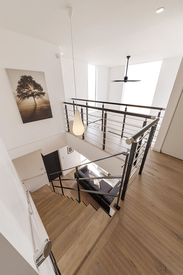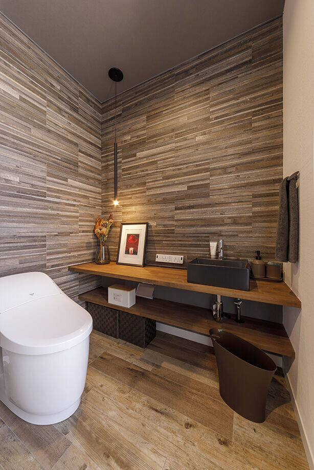 スタイリッシュモダンに仕上げた外観は、交通量の多い通りに配慮して1階の窓は少なく、庭と吹抜けから十分な採光ができるように設計しました。明るくプライベート性が保たれたLDKは実際の広さ・22畳より広く感じられ、シンプルな色味とオレンジの差し色が光るハイセンスなインテリアコーディネートが印象的。より広く感じられるようにローベットを採用した寝室や、見せる収納でおしゃれなクローゼット、さらに2階に広がる贅沢な吹抜けと空間をつなぐ空中階段など、日々の暮らしに特別感をプラスする素敵な邸宅になりました。