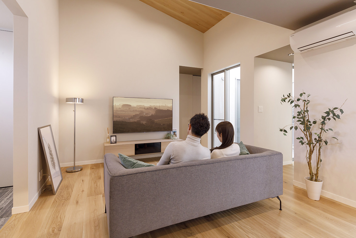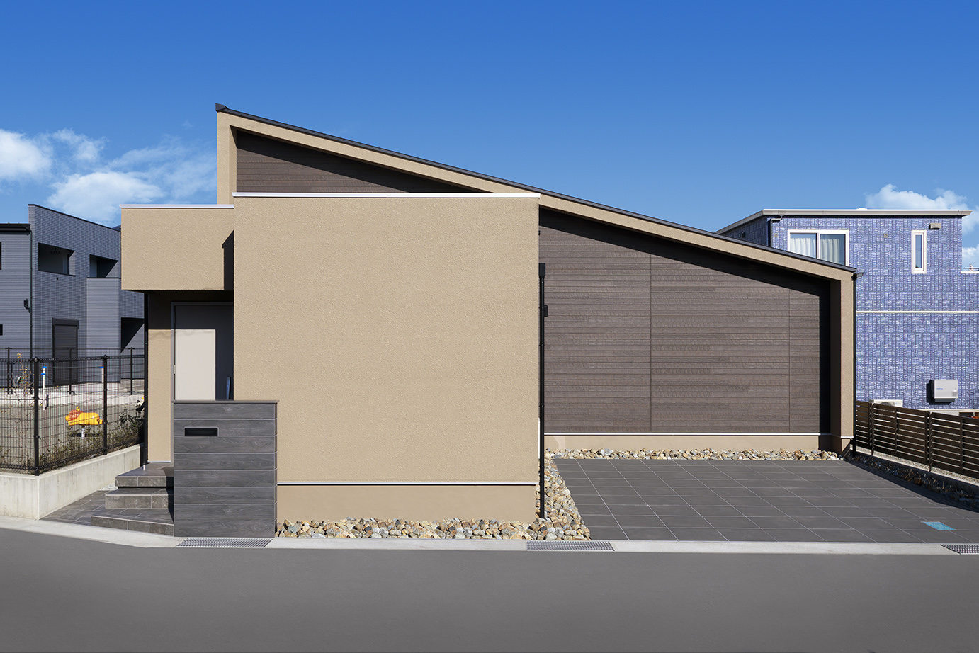 オールブラウンのシックな外観からは、平屋とは思えないほどの迫力が感じられます。ドアを開けた瞬間、目線が遠くまで抜けていくシックで重厚な土間空間。造作棚にはあえて扉を設けず、間接照明で照らして「見せる空間」を演出しました。最高4.3mの勾配天井を採用したリビングには、無垢材を使用したことで空間に変化が生まれました。LDKと寝室、子ども部屋との境界線の役割も担う、4畳の中庭を設けたことで各居室に十分な光が届きます。大容量のウォークインクローゼットがある6畳の主寝室はトーンを抑え下がり天井に。ライトアップされると美術館のような美しい佇まいを見せる平屋が完成しました。