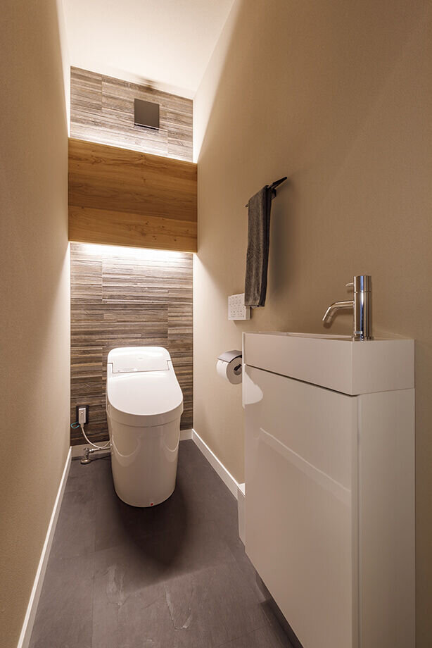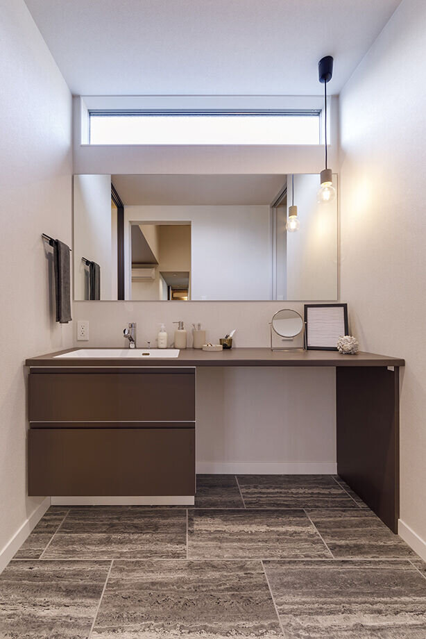 オールブラウンのシックな外観デザインは平屋とは思えないほどの迫力。ライトアップされると、まるで美術館のような美しい佇まいを見せてくれます。最高4.3mの勾配天井で目線の高さに変化をつくったリビングには、中庭から程よく光が差し込み、ダイニングルームには対面キッチンを採用したことで家族の会話も楽しめる空間に。玄関から直接アクセスできるサニタリーの動線や、50坪の限られた土地を活かして3LDK・駐車場2台分のスペースも確保するなど、洗練された美しい佇まいの邸宅になりました。